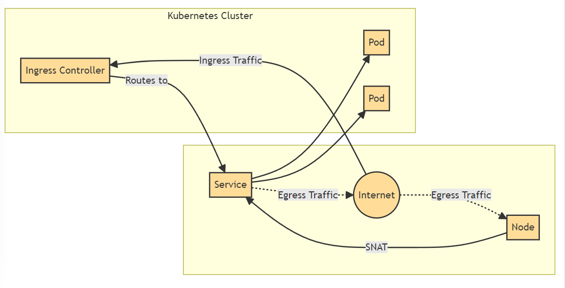 - Egress: Kubernetes Service에서 인터넷으로 트래픽을 라우팅하려는 경우 이를 사용한다. 이 경우 iptables는 소스 NAT를 수행하므로 트래픽이 Pod가 아닌 노드에서 나오는 것처럼 보인다.