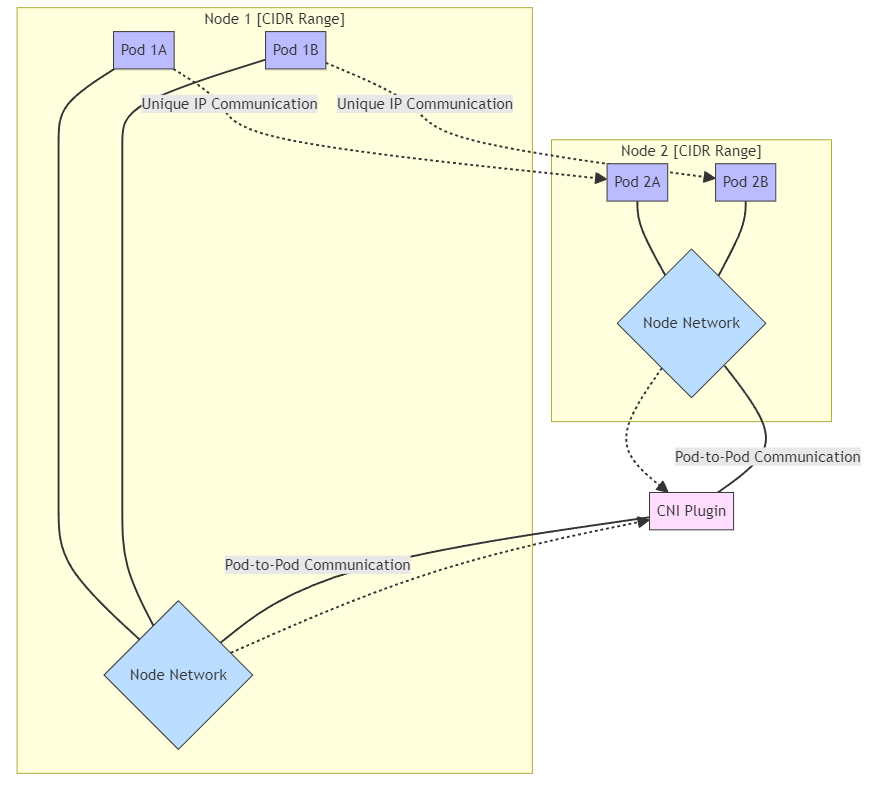 이는 CNI(컨테이너 네트워크 인터페이스) 표준을 구현하는 기본 네트워크 플러그인을 통해 달성되며, 다양한 구현(예: Calico, Flannel 또는 Cilium)은 이 노드 간 파드 간 통신을 활성화하는 다양한 방법을 제공한다.