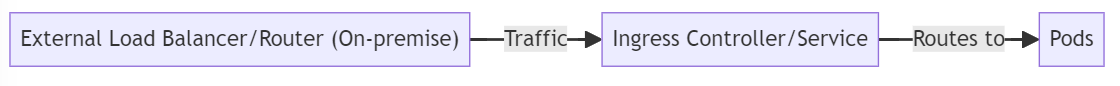 온프레미스 환경에서는 NodePort 또는 ClusterIP 서비스 유형을 사용하여 인그레스 컨트롤러에 접근할 수 있으며, 외부 로드 밸런서가 이 서비스 유형에 맞게 트래픽을 라우팅한다.