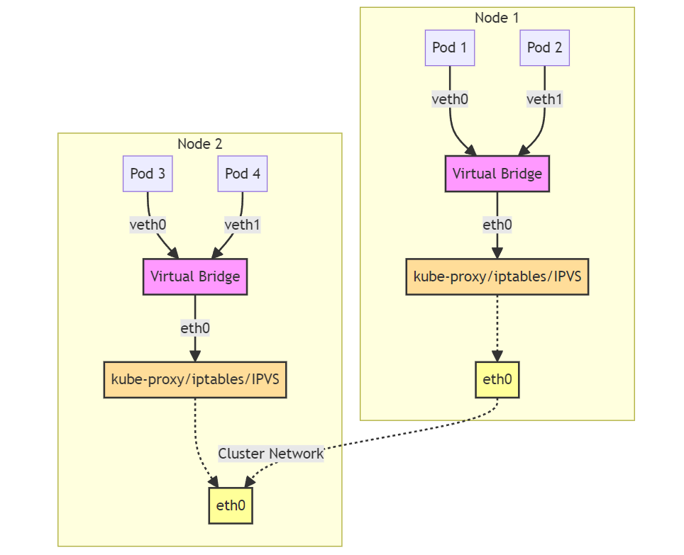 - 가상 브릿지(Virtual Bridge): 파드 내의 eth0과 veth 페어를 통해 연결된다. 이 브릿지는 파드가 노드의 네트워크와 통신할 수 있도록 하는 중간 통신 역할을 한다.