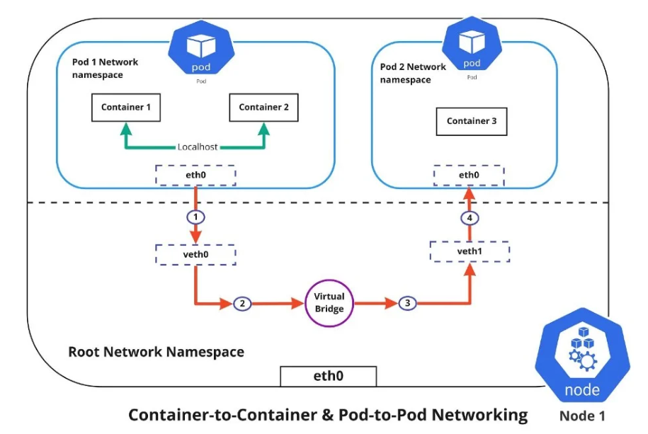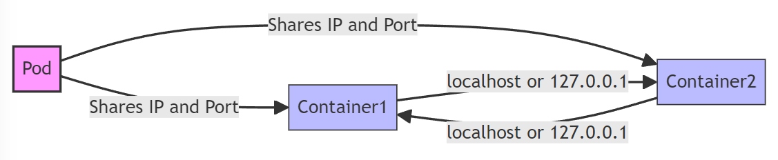 단일 Pod 내에서 Kubernetes를 사용하면 여러 컨테이너가 동일한 네트워크 네임스페이스를 공유할 수 있다. 이는 동일한 Pod 내의 컨테이너가 동일한 IP 주소와 포트 공간을 공유하므로 localhost를 사용하여 서로 통신할 수 있음을 의미한다.