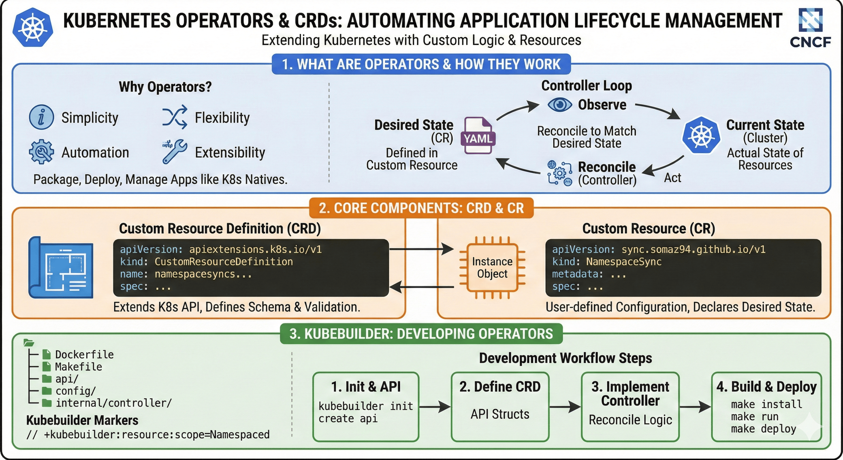 Kubernetes Operator는 애플리케이션 로직을 관리하고 Kubernetes Control Plane의 일부이다. 따라서 루프를 실행하여 클러스터의 실제 상태와 원하는 상태를 확인하고 , 두 상태가 멀어질 때 이를 조정하는 역할을 하는 컨트롤러이다. 단순성과 유연성, 그리고 자동화는 오퍼레이터 생성을 가능하게 할 뿐만 아니라 이는 Kubernetes 아키텍처의 초석을 형성하는 기본 원칙이다.