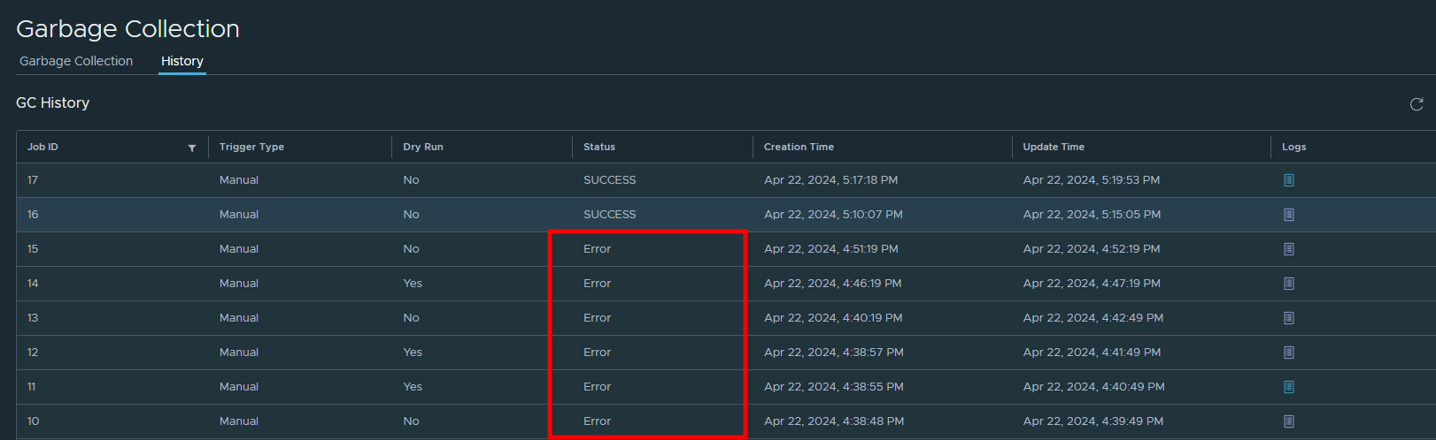 Garbage Collection을 실행했지만 Status Error 가 발생했다.