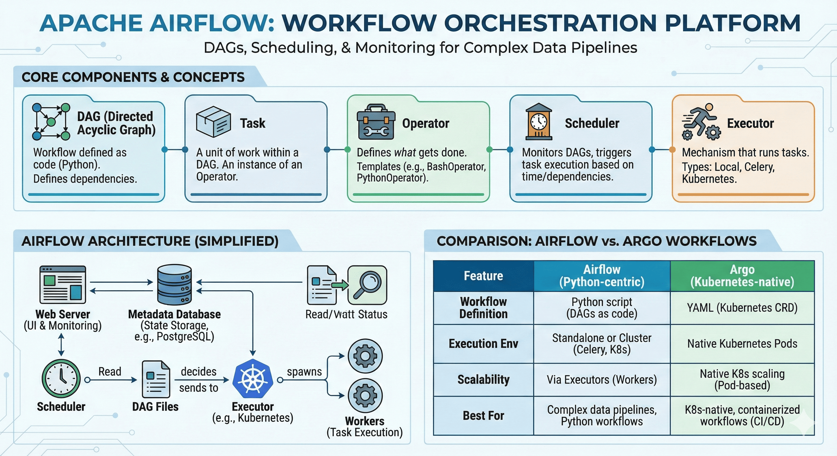 이번 글에서는 Airflow의 핵심 개념과 구성 요소, 그리고 Kubernetes 기반 오케스트레이션 도구인 Argo Workflow와의 비교를 통해 어떤 환경에 적합한지 이해해보자.