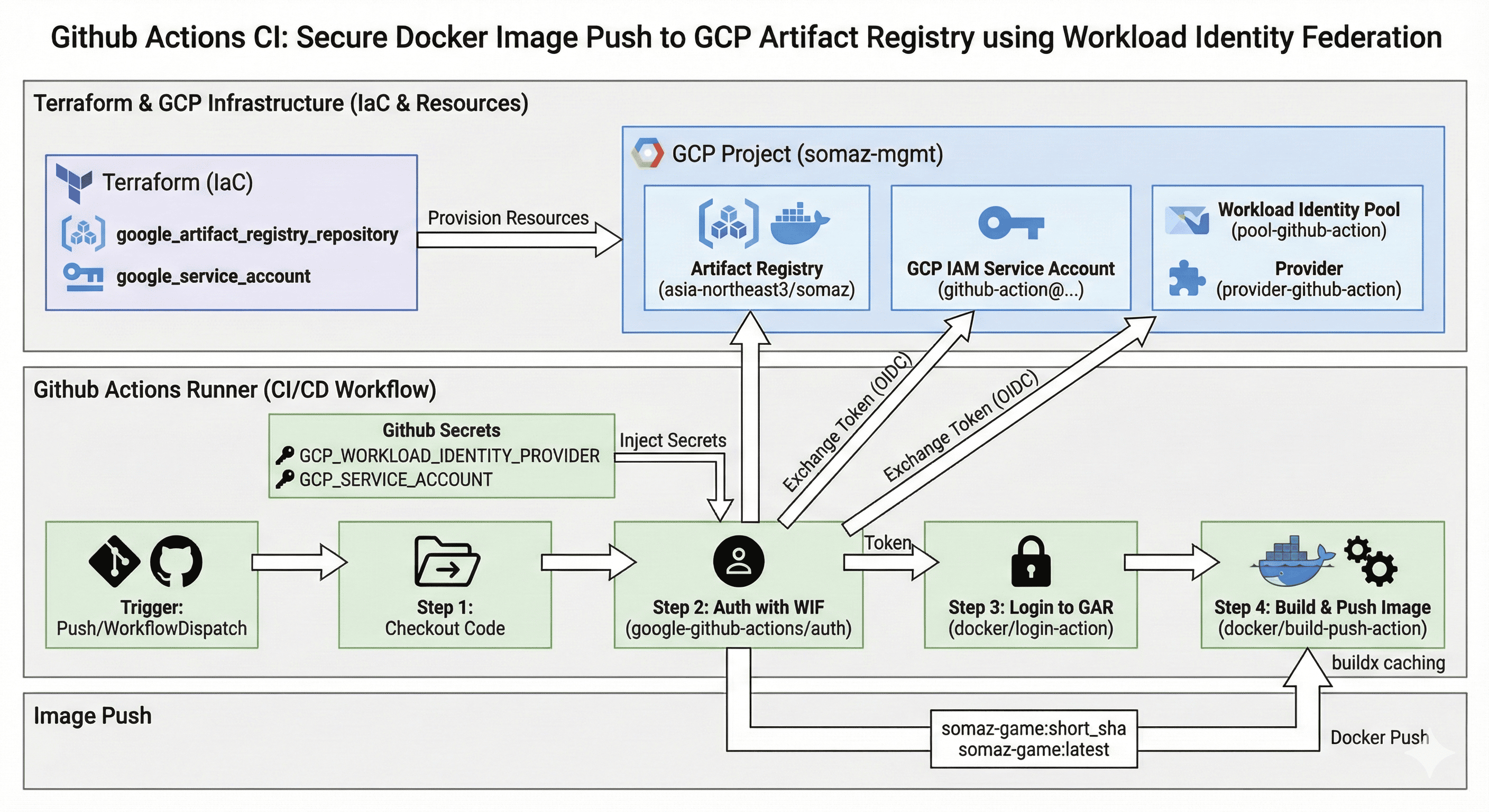 Github Actions Workflow에서 GCP 인증 및 이미지 빌드, Artifact Registry Push까지의 흐름을 단계별로 구성해보자.