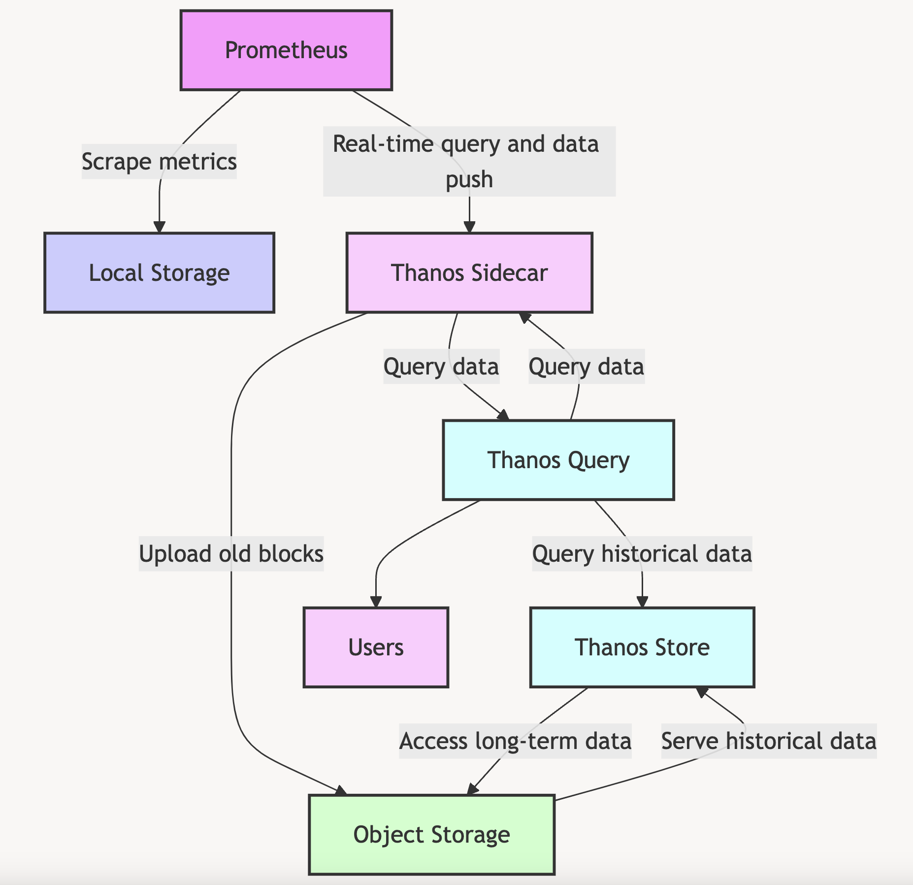 Thanos 구성요소들과 Prometheus의 데이터 흐름을 순서대로 설명하면 아래와 같다.