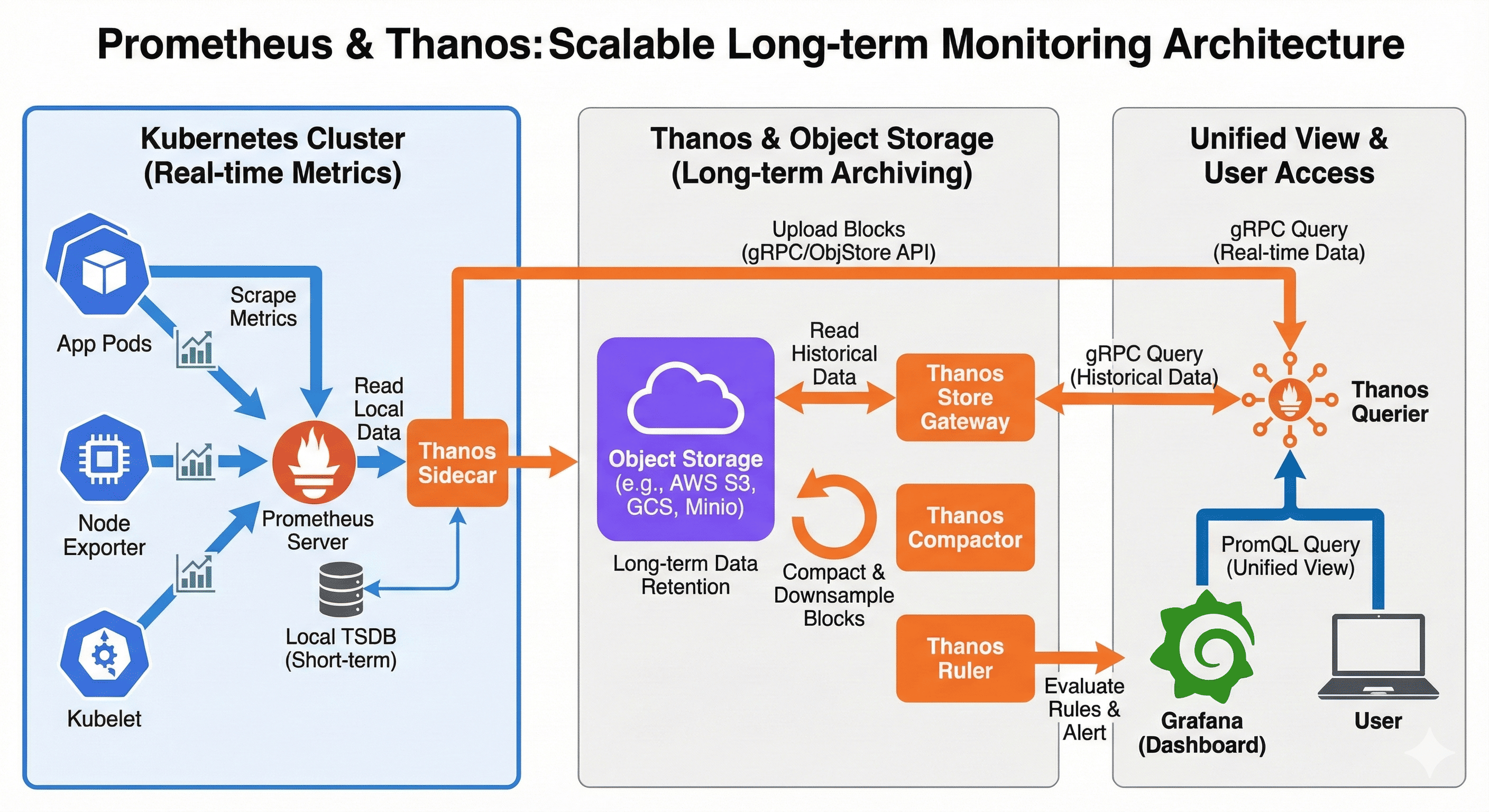 - Sidecar: Prometheus 서버에 배치되어 실시간 데이터를 접근하고, 필요한 경우 외부 스토리지로 업로드한다.
