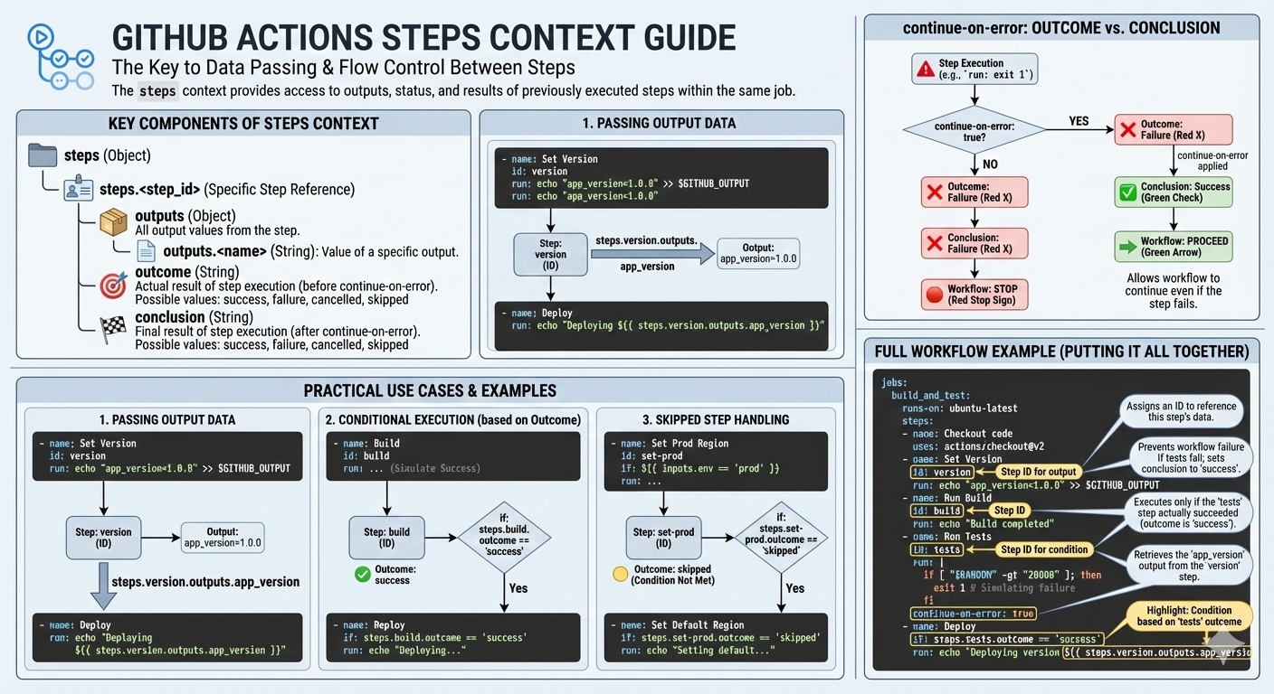 GitHub Actions의 steps Context는 단순한 출력값 전달을 넘어, 조건 분기, 에러 처리, 다단계 의존성 관리에 이르기까지 다양한 CI/CD 시나리오의 핵심 도구로 활용된다.