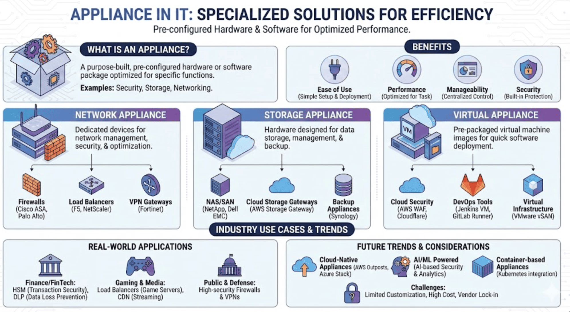 IT 분야에서 어플라이언스는 주로 네트워크 어플라이언스, 스토리지 어플라이언스, 가상 어플라이언스 등과 같이 특정 작업을 효율적으로 수행하도록 설계된 장치나 소프트웨어를 지칭하는 데 사용된다.