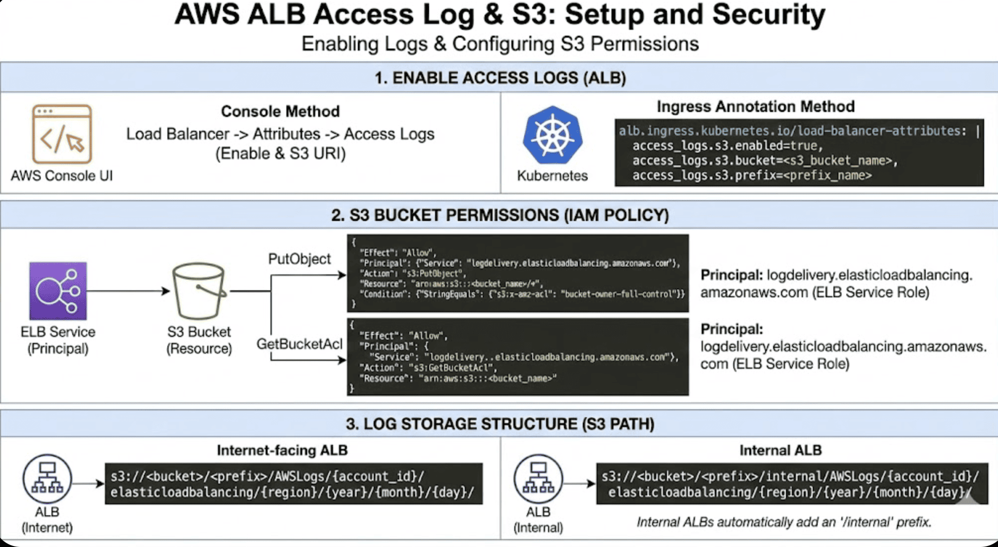특히 Kubernetes 환경에서는 `alb.ingress.kubernetes.io/load-balancer-attributes` 어노테이션을 통해 손쉽게 로그 설정이 가능하며, 서비스 주체(logdelivery.elasticloadbalancing.amazonaws.com)를 활용한 정확한 S3 권한 정책 구성이 핵심이다.