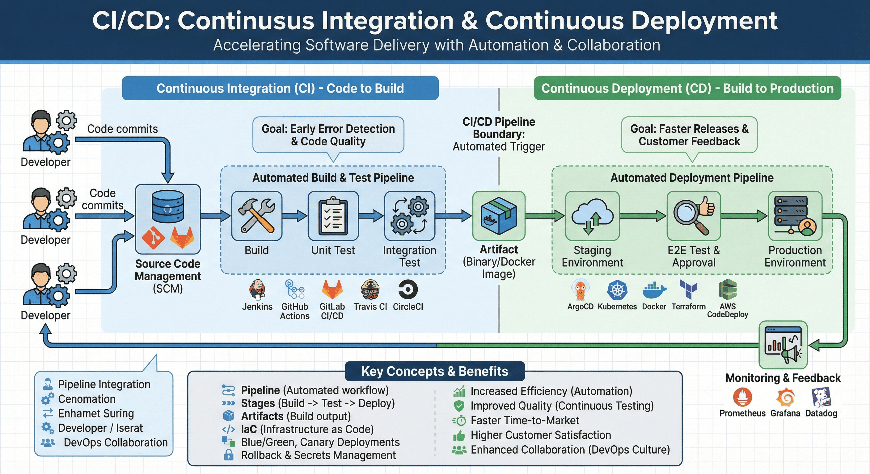 CI/CD는 현대 소프트웨어 개발 및 운영에서 핵심적인 자동화 전략으로, 코드 통합부터 테스트, 빌드, 배포까지의 전 과정을 자동화함으로써 개발 생산성과 서비스 안정성을 극대화하는 방법론이다.