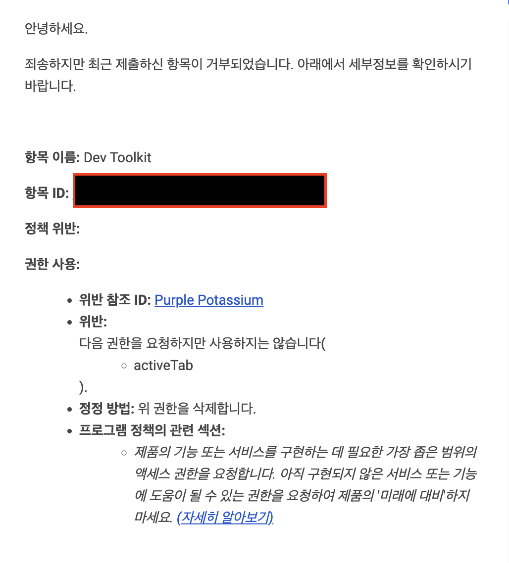 그리고 거부됬을때는 친절하게 이유를 알려준다? Chrome 확장 프로그램은 필요한 최소한의 권한만 요청해야 한다.
