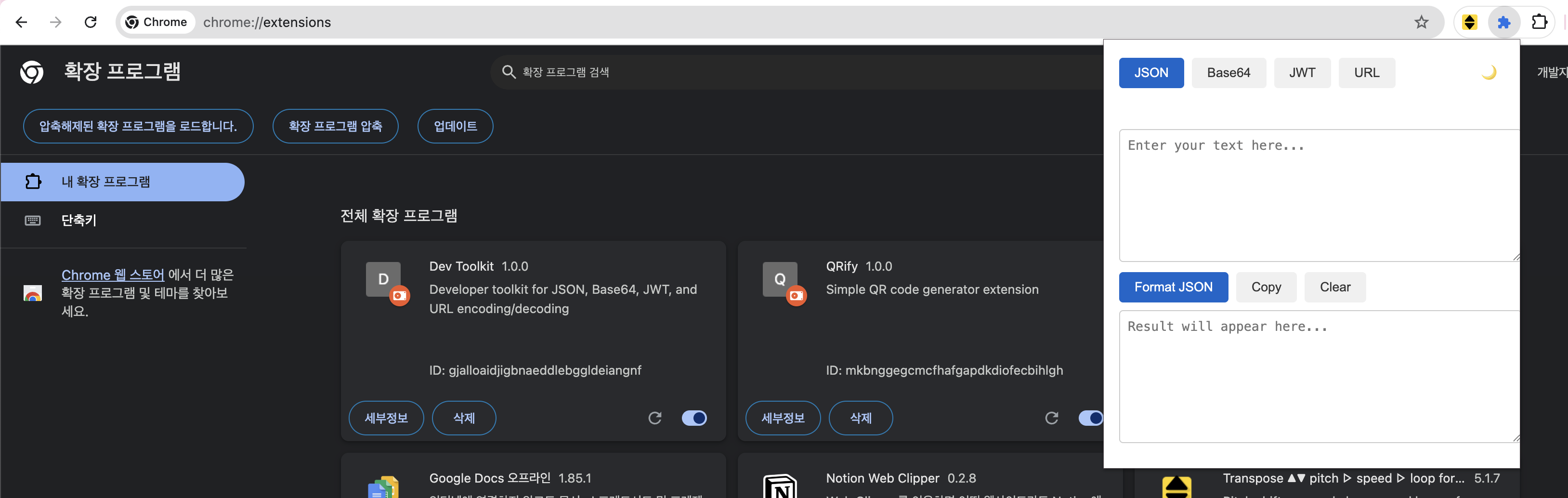 또 하나의 Extension은 JSON, Base64, JWT, URL 값을 Formating, Encoding, Decoding 하는 Extension 이다.