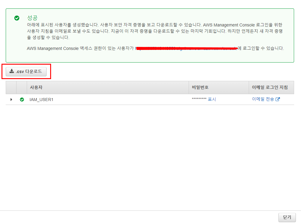 - `.csv` 다운로드 버튼을 클릭하여 엑세스 키(Access Key ID 및 Secret Access Key)를 저장