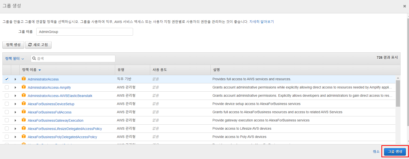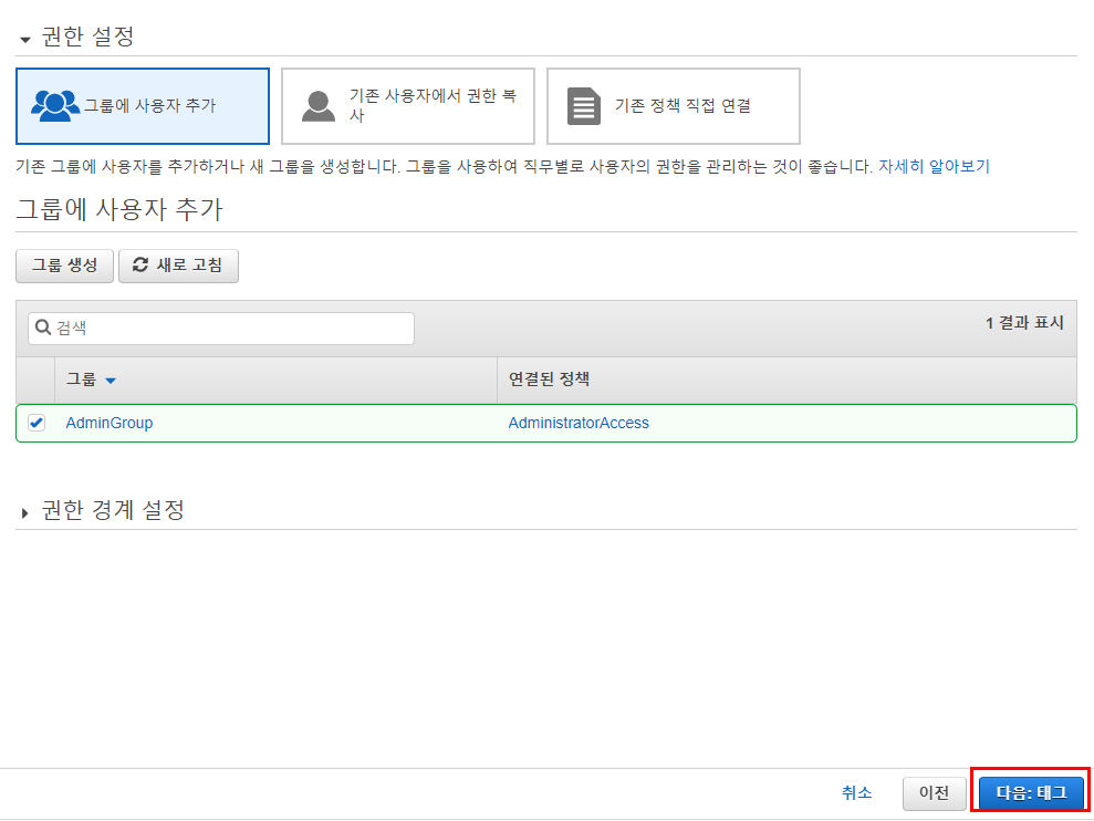- 관리자 그룹(AdministratorAccess)을 생성하여 사용자를 추가할 수도 있다.