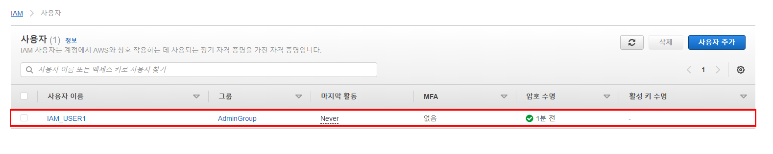 - 생성된 IAM 사용자는 AWS 리소스에 접근할 수 있는 사용자 계정이 된다.