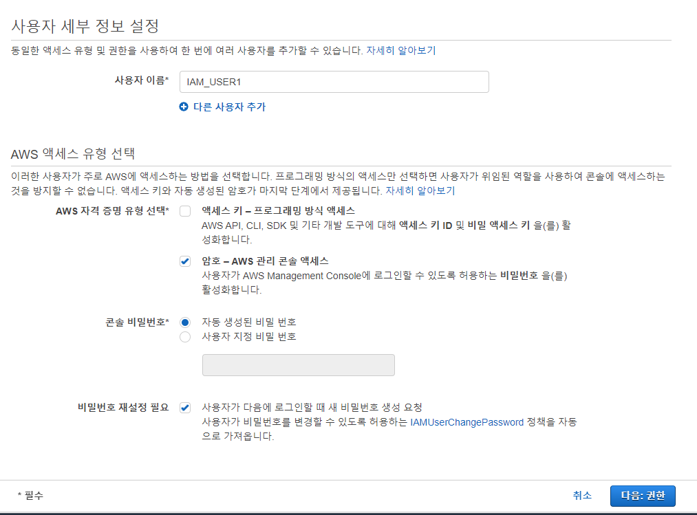 - AWS Management Console 액세스 설정 (프로그래밍 방식 액세스 및 AWS 콘솔 액세스 선택 가능)