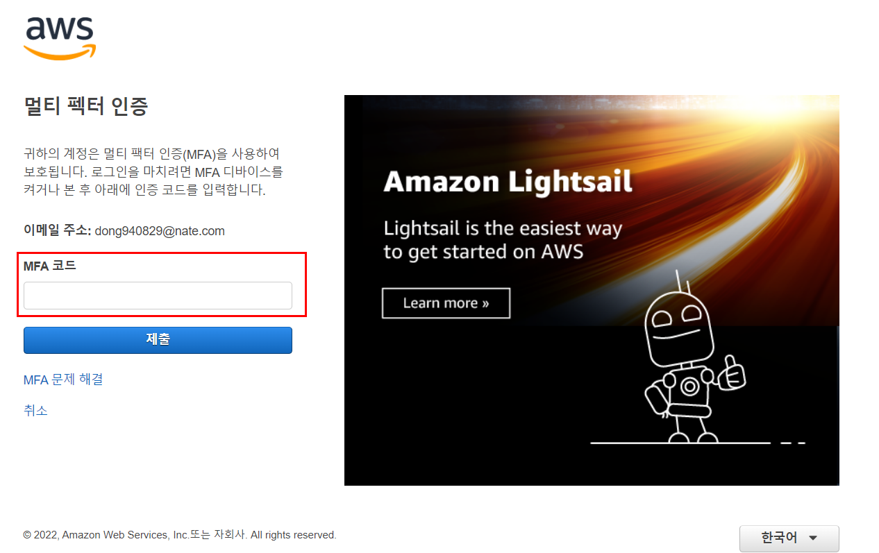이제 AWS 루트 계정으로 로그인 시 MFA 코드 입력이 필수가 된다.
