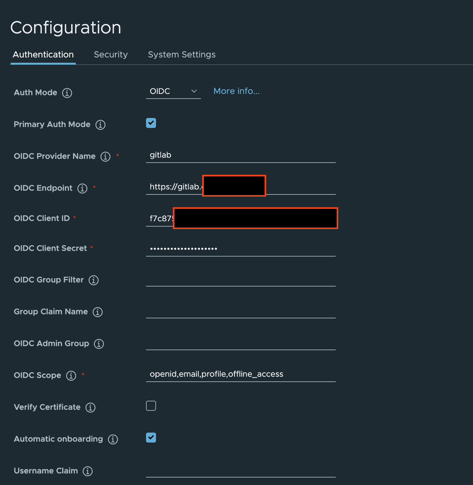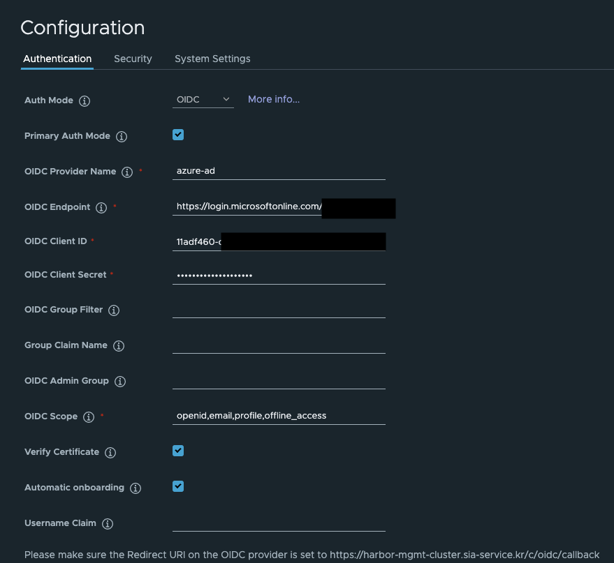 clientId(=Application ID)와clientSecret(=Secret)을 발급받아야 한다. - Harbor에서 OIDC 설정을 활성화하고, GitLab 또는 Azure AD의 OAuth 정보를 입력해야 한다.
