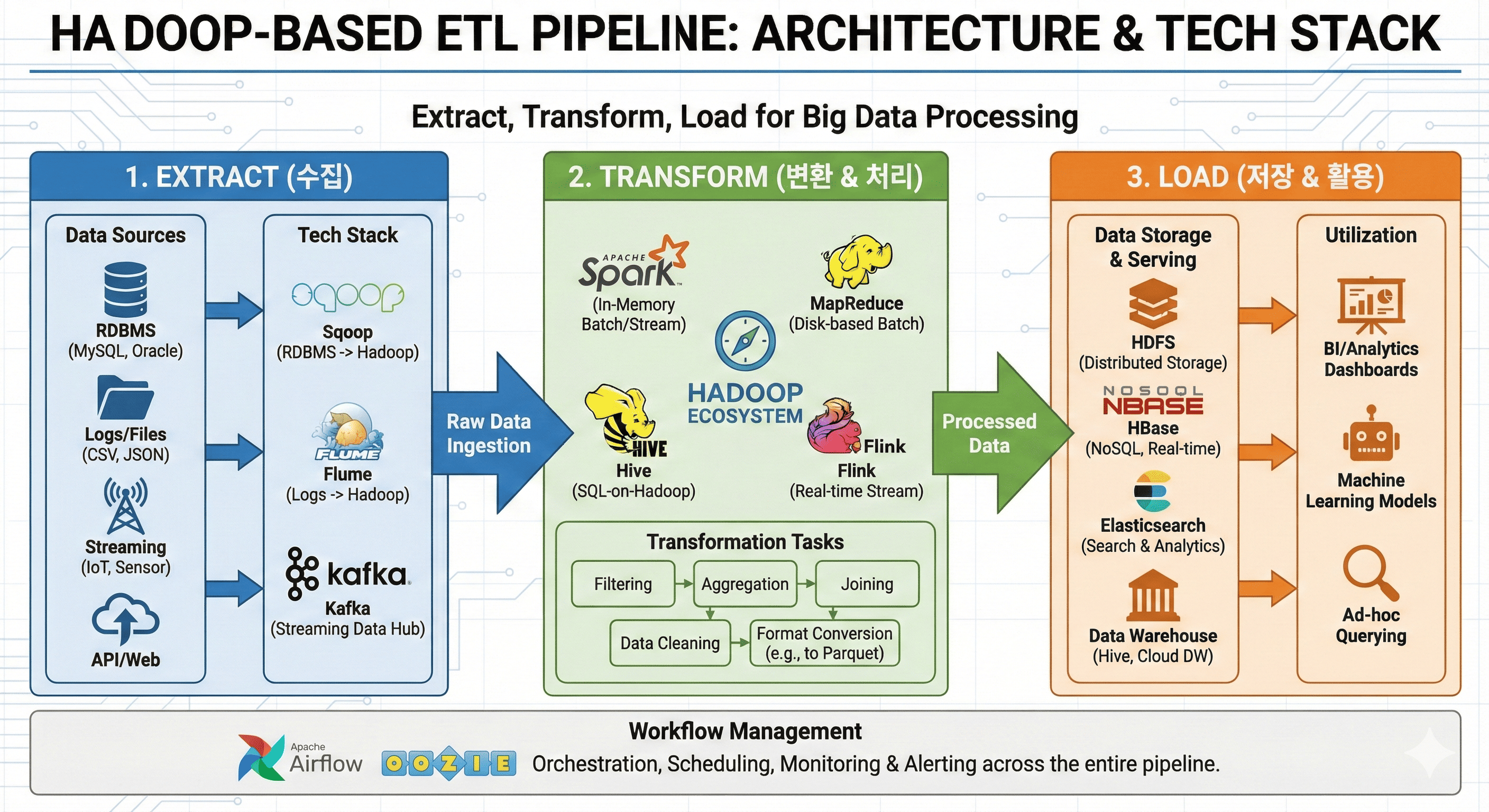 이 글에서는 Hadoop 기반의 ETL 파이프라인 구성 요소와 각 단계별 주요 기술 스택을 설명해보겠다.