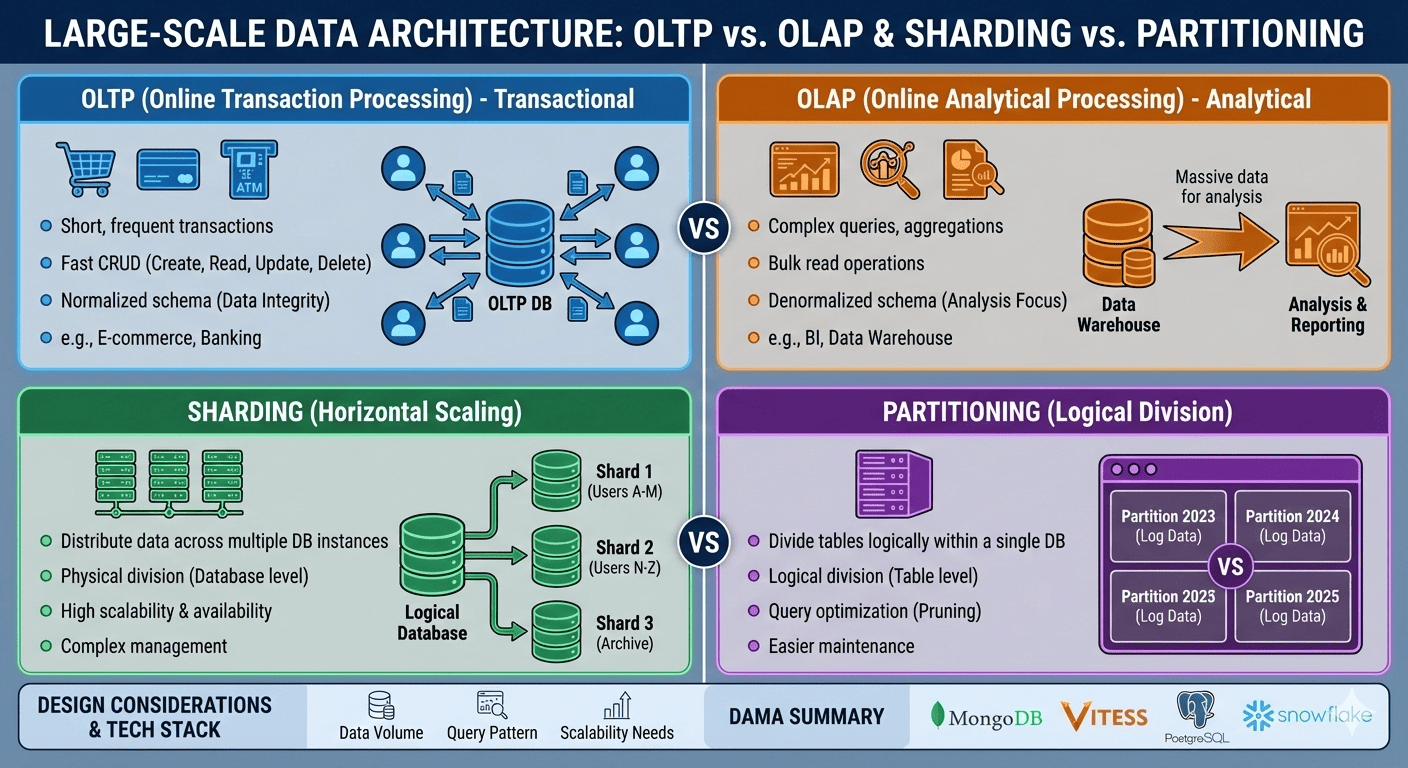 트랜잭션 중심의 OLTP와 분석 중심의 OLAP의 차이를 명확히 이해하고, 상황에 맞게 샤딩과 파티셔닝을 적절히 조합하는 것이 중요하다. 궁극적으로는 데이터 구조, 쿼리 유형, 유지보수 편의성까지 고려하여 시스템을 설계해야 하며, 이를 통해 성능과 확장성을 모두 만족하는 아키텍처를 구현할 수 있다.