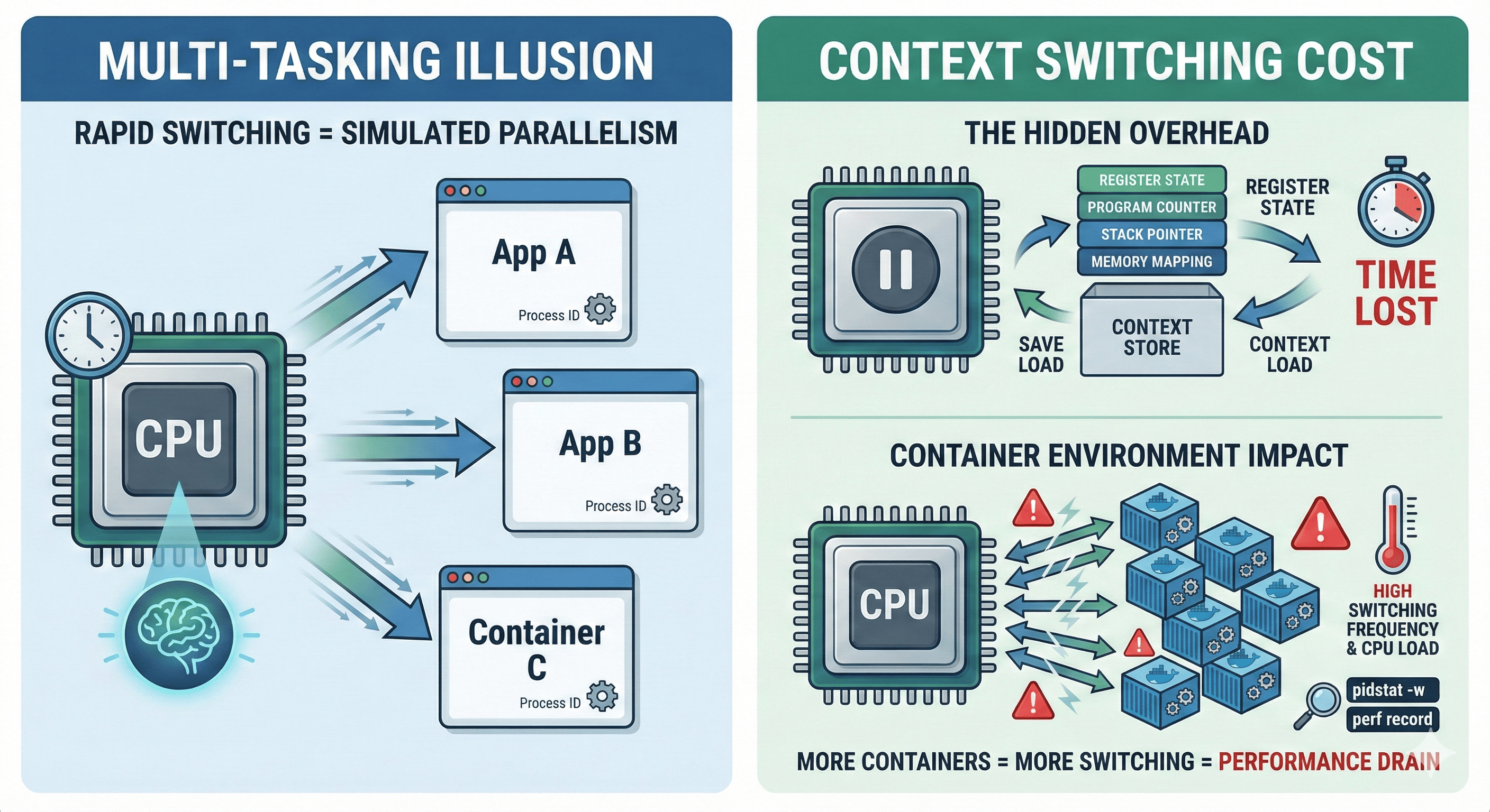우리는 매일 여러 컨테이너, 프로세스, 스레드를 동시에 실행하면서 “멀티태스킹”을 당연하게 여기지만, 실제로 CPU는 매 순간 오직 하나의 작업만 처리한다.