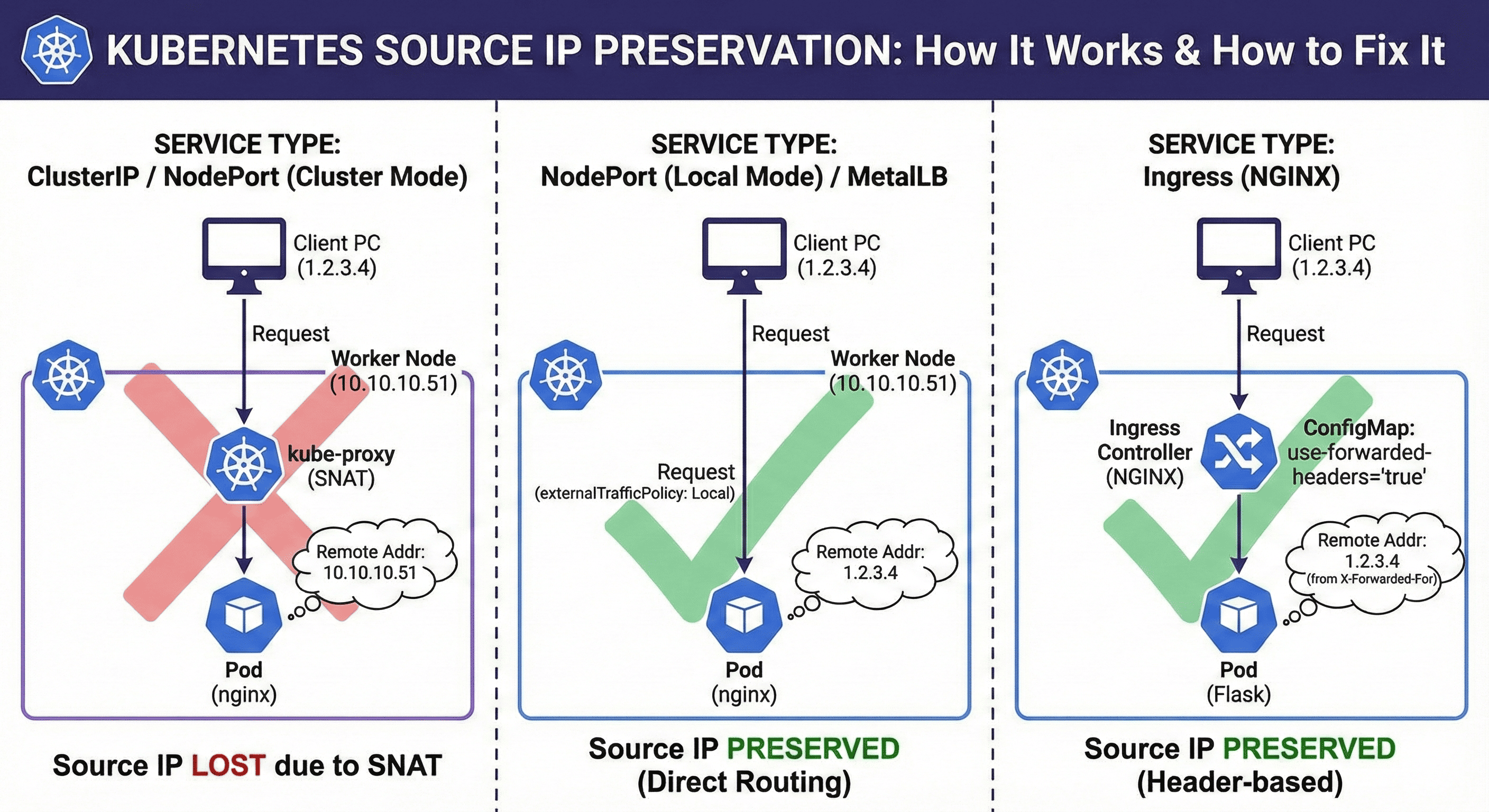 또한 실습을 통해 실제 요청 시 IP가 어떻게 보이는지, 어떻게 보존할 수 있는지를 확인하는 과정을 Flask 앱과 MetalLB + Ingress-NGINX 조합을 이용한 실습을 통해 다룬다.