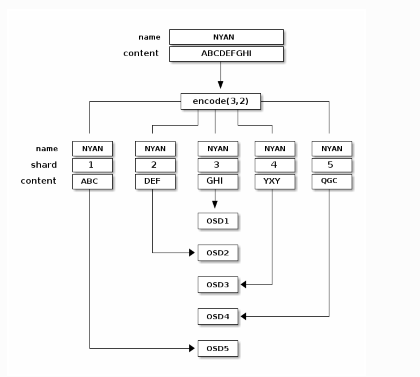 - k=3, m=2이면, 총 5개의 조각으로 저장되고 2개까지 손실돼도 복구가 가능하다.