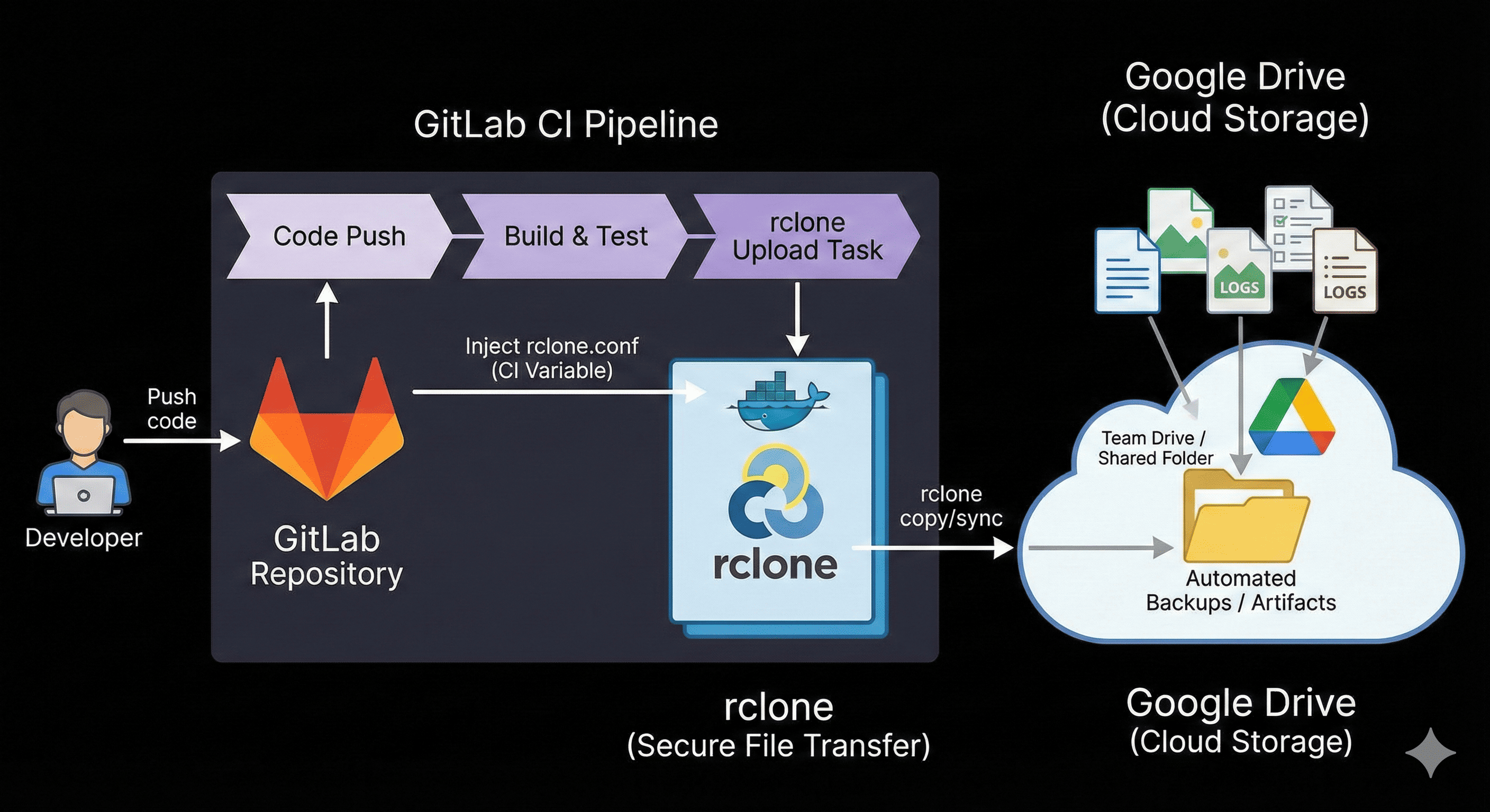 rclone은 다양한 클라우드 스토리지를 지원하며, 특히 Google Drive와의 연동이 강력하고 안정적이다. GitLab CI와 연동하면, 파일 업로드를 자동화하여 협업의 효율성과 기록 관리를 동시에 챙길 수 있다.