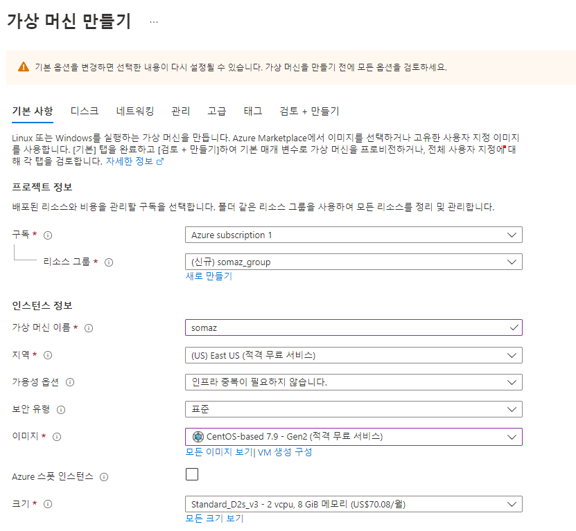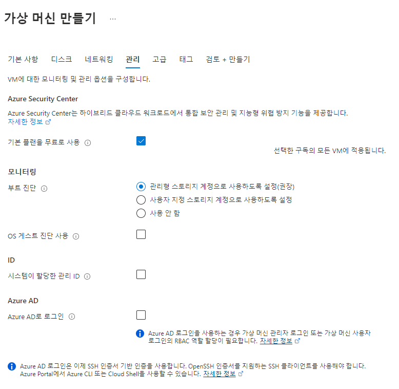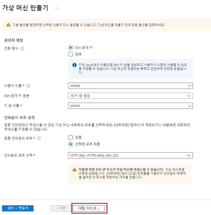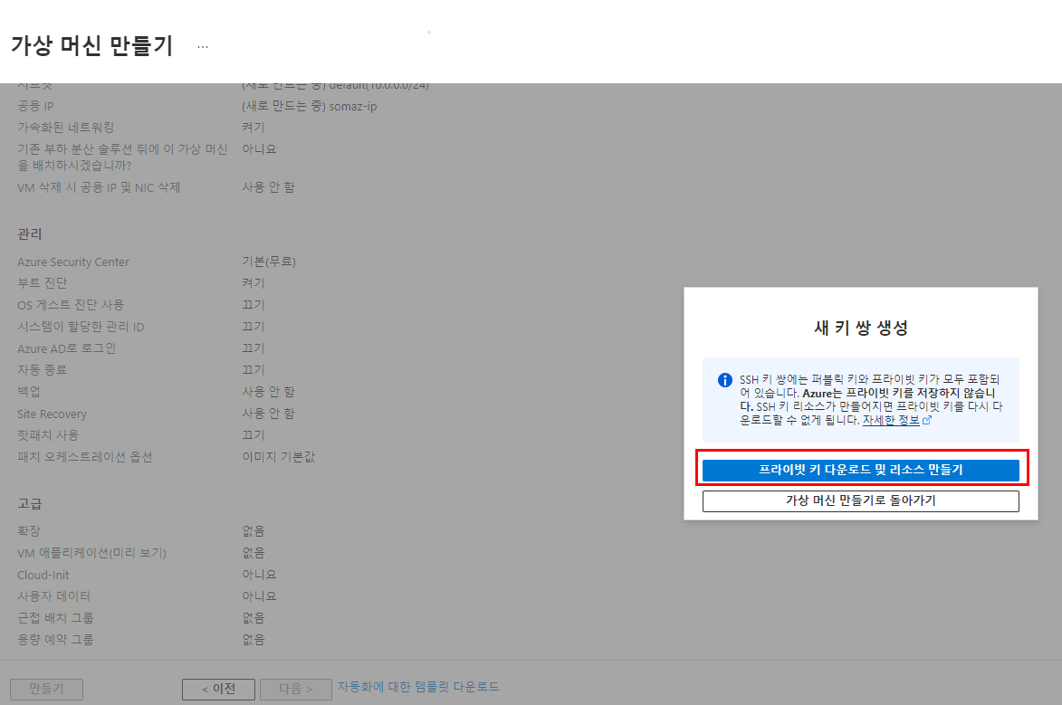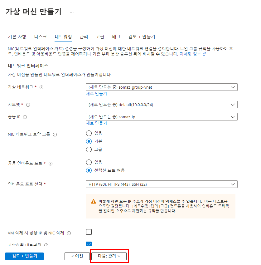 - 기본값 유지 (Virtual Network, Subnet, Public IP 자동 생성)