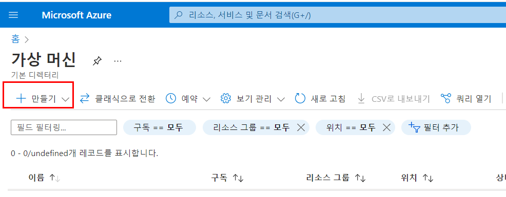 - Azure Portal 접속 → "가상머신(Virtual Machines)" 클릭 → "만들기(Create)" 버튼 클릭