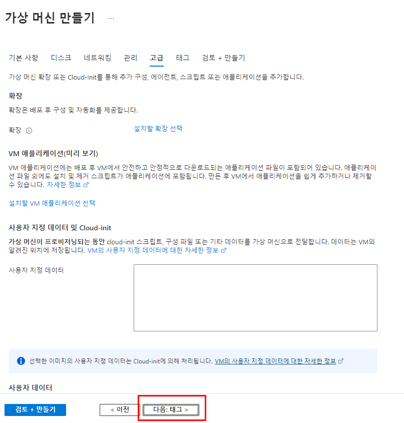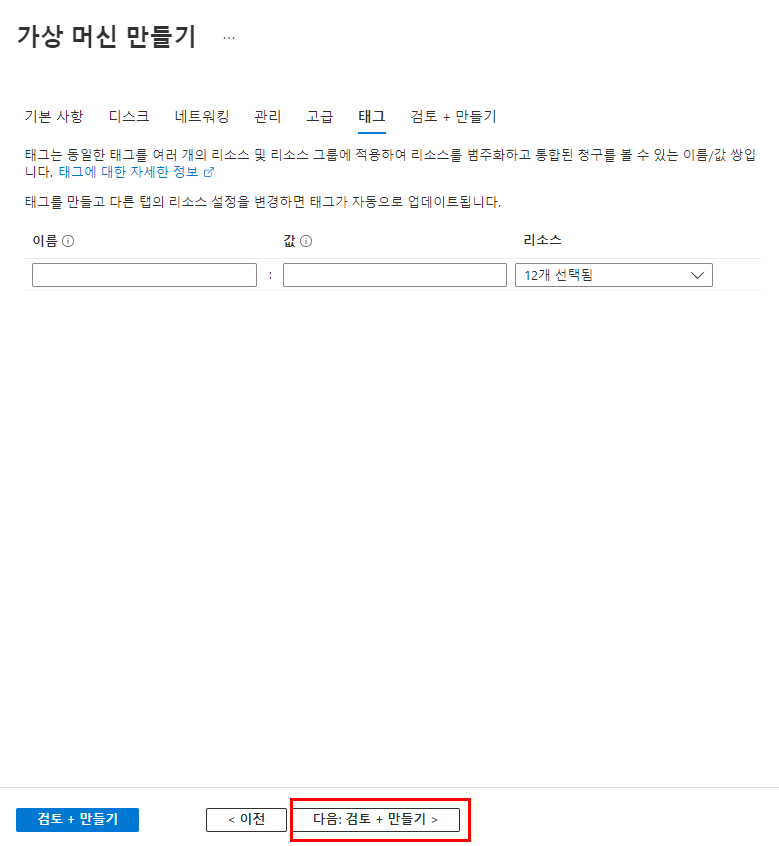 | VM 크기(Size) | 가상 머신의 CPU, RAM 스펙 선택 |