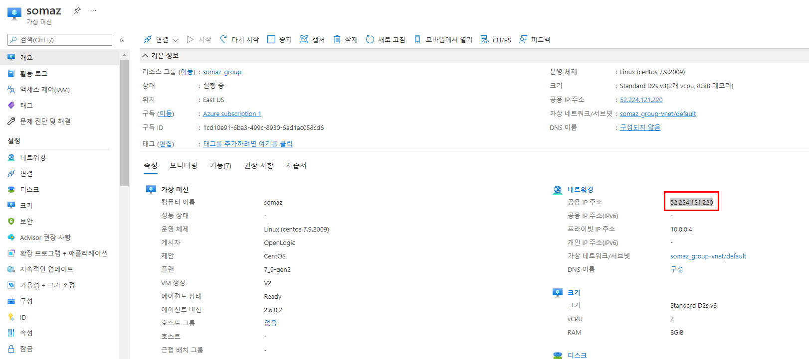 Azure Portal → VM → Public IP Address(공용 IP 주소) 확인