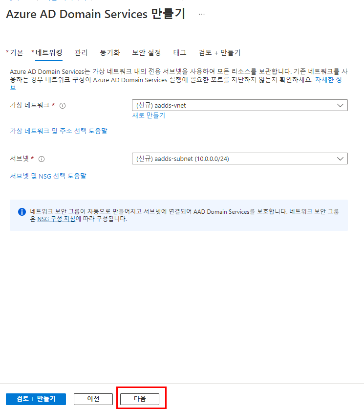 - 서브넷 구성: Azure AD DS는 특정 서브넷에서 실행되므로, 전용 서브넷을 구성하는 것이 권장된다.