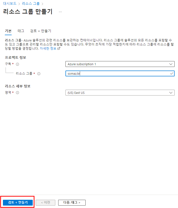 https://portal.azure.com 에 관리자 계정으로 로그인 - 리소스 그룹 - 추가