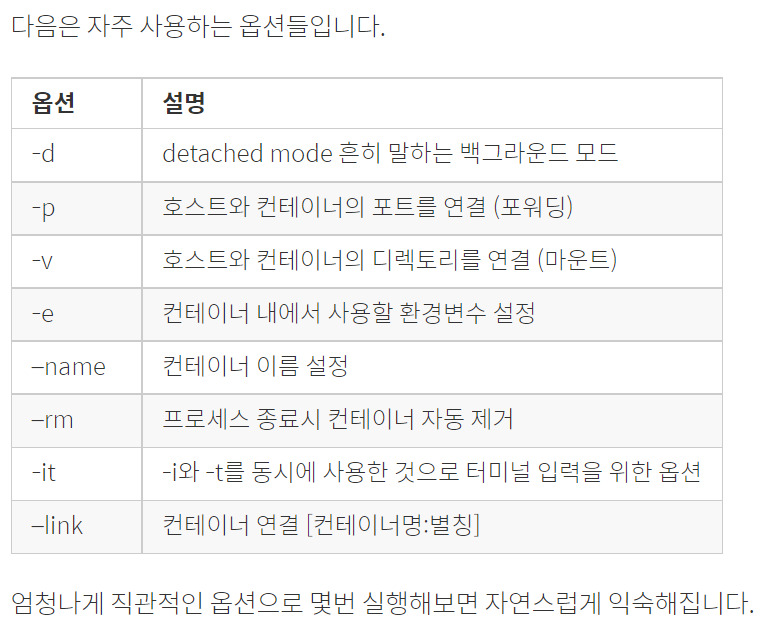 docker run <옵션1><서브옵션> ...<이미지명><실행할 파일>