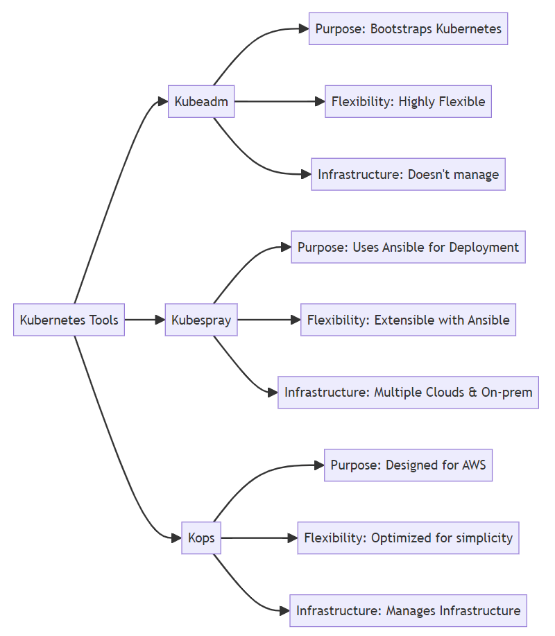 Kubeadm은 클러스터의 기본 구성을 위한 도구, Kubespray는 Ansible 기반의 다양한 환경에서의 배포 도구, 그리고 Kops는 클라우드 환경에서 클러스터의 전체 생명 주기를 관리하기 위한 도구로 사용된다.