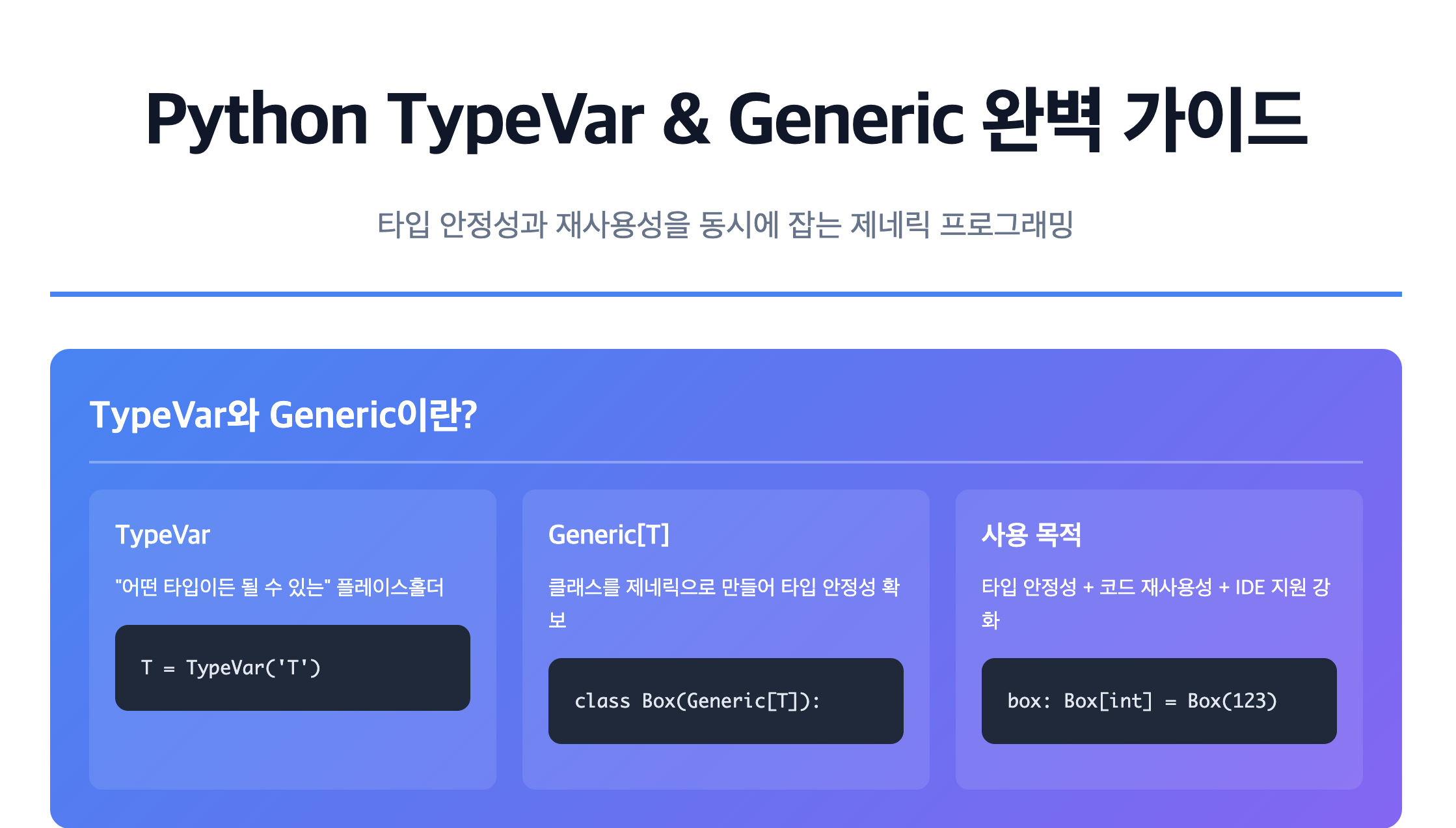OverviewPython 코드를 작성하다 보면 `TypeVar('T')` 나 `Generic[T]` 를 사용하게 된다. 코드를 복사해서 쓰긴 하는데, 정확히 뭘 하는 건지 모르겠다면?이번 글에서 TypeVar와 제네릭의 개념부터 실전 활용까지 완벽하게 정리한다. TypeVar란 무엇인가? 기본 개념from typing import TypeVarT = TypeVar('T') TypeVar는 "제네릭 타입 변수"를 선언하는 것이다. 쉽게 말하면T는 "어떤 타입이든 될 수 있는" 플레이스홀더사용할 때 구체적인 타입이 결정됨한 번 정해지면 그 타입으로 고정됨 제네릭이 필요한 이유 문제 상황: 타입이 불명확한 코드# 제네릭 없이class ProcessResult: def __init__(se..