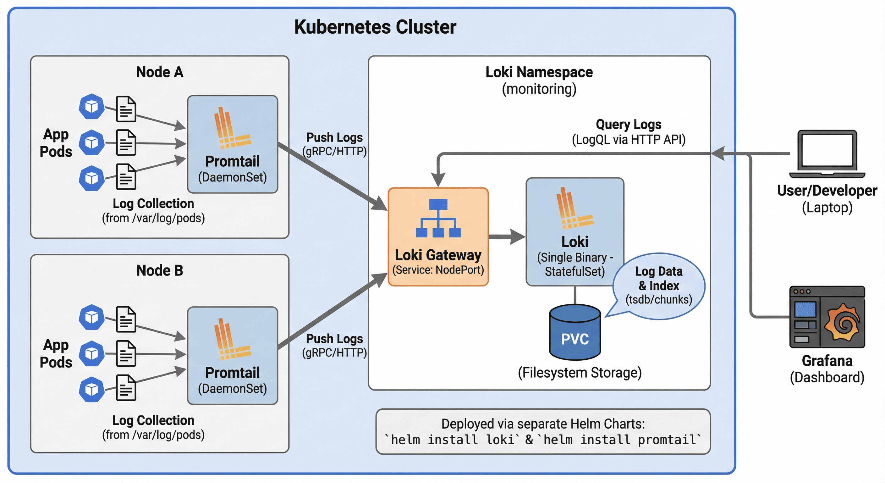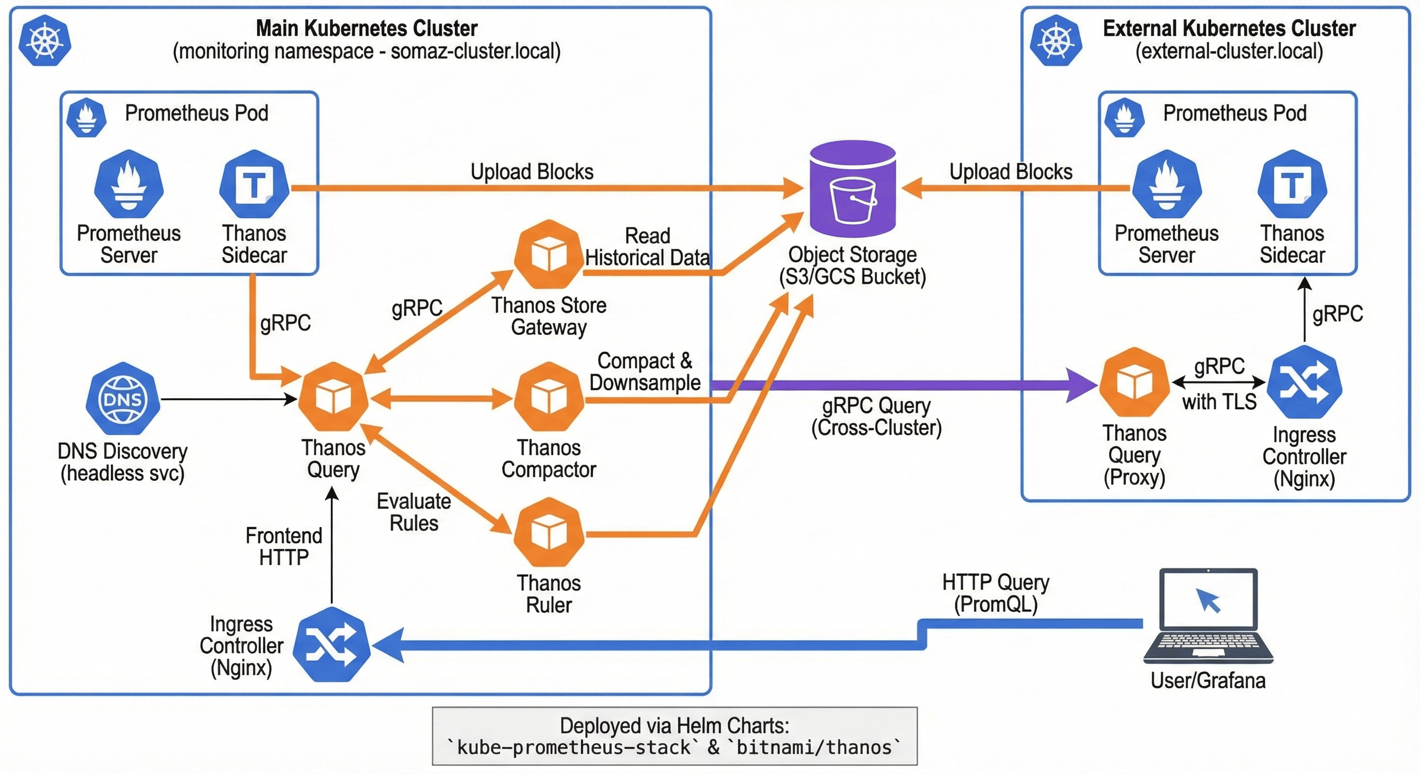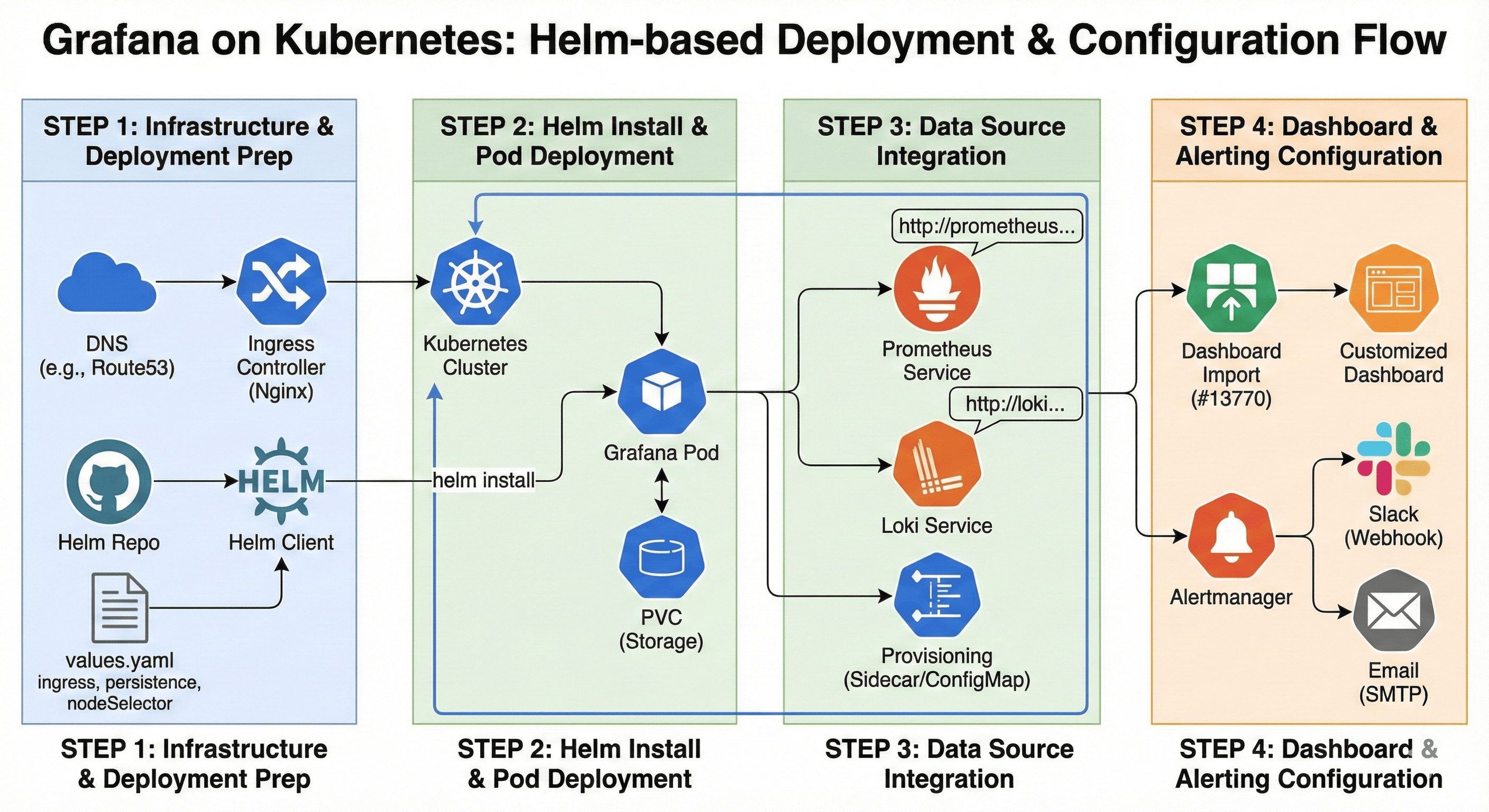Overview클러스터 내 상태를 시각화하고 알림까지 자동화할 수 있는 Grafana는 DevOps 환경에서 빠질 수 없는 필수 툴이다.특히 Kubernetes 환경에서는 Helm을 활용해 빠르게 배포하고 유지관리할 수 있어 실무에서 매우 유용하게 사용된다. 이 글에서는 Helm Chart를 활용한 Grafana 설치 과정을 DNS 설정부터 Dashboard 커스터마이징까지 단계별로 정리해보겠다. 📅 관련 글2024.03.05 - [Monitoring] - Fluent Bit (With Loki)2024.09.12 - [Monitoring] - Prometheus와 Thanos란?2024.09.12 - [Monitoring] - Prometheus 와 Thanos 설치 및 구성2024.09.1..