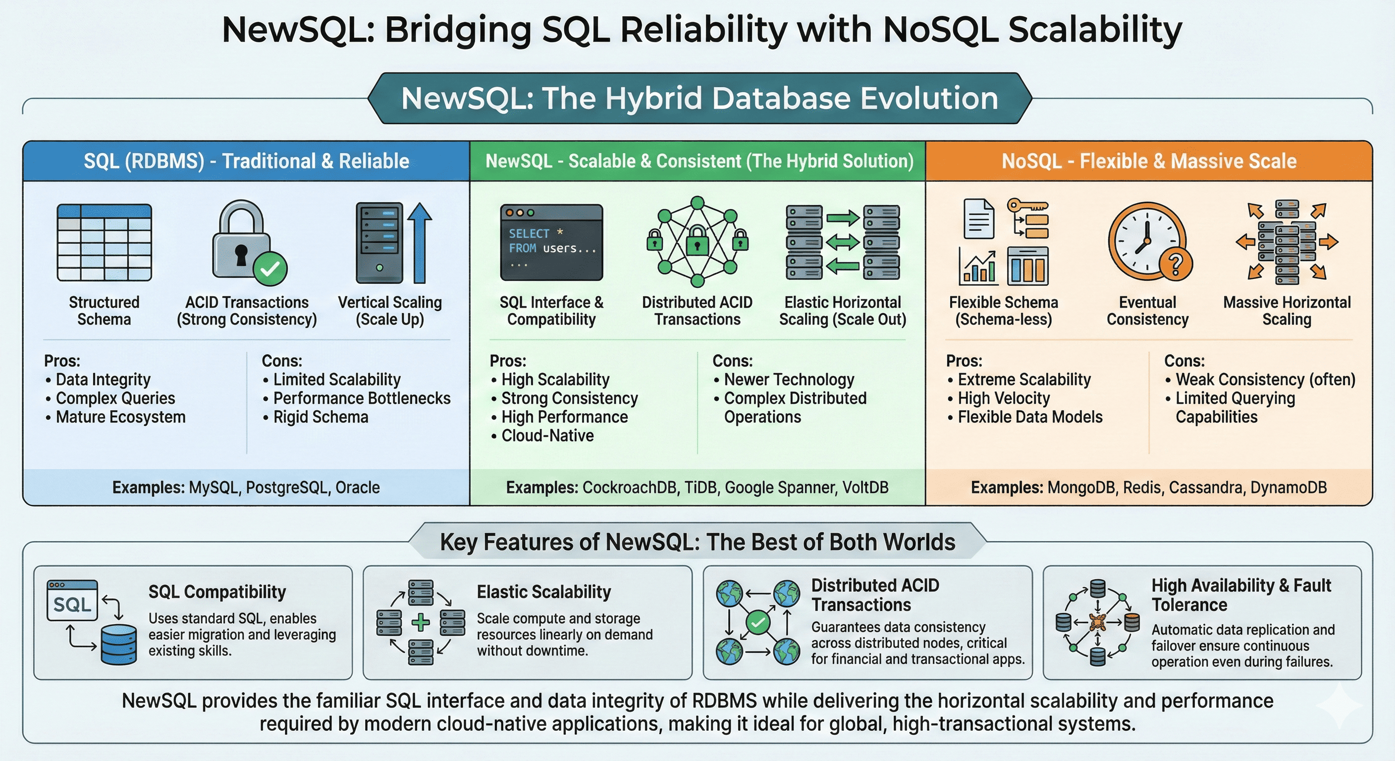 Overview빅데이터와 클라우드 기반의 확장형 아키텍처가 대두되면서, 기존의 RDBMS(Relational Database Management System)와 NoSQL은 각자의 장단점으로 인해 다양한 선택지를 제공해왔다.그러나 두 가지 모두에서 일관성과 확장성 간의 균형을 찾는 것이 어려운 과제로 남았다. 이러한 한계를 극복하고자 등장한 것이 바로 NewSQL이다.NewSQL은 전통적인 관계형 모델을 유지하면서도, NoSQL이 제공하는 수평 확장성과 고성능 처리 능력을 갖춘 차세대 데이터베이스 시스템이다. 📅 관련 글 2022.09.26 - [Open Source Software] - Redis(Remote Dictionary Server)란?2023.04.21 - [Database] - D..