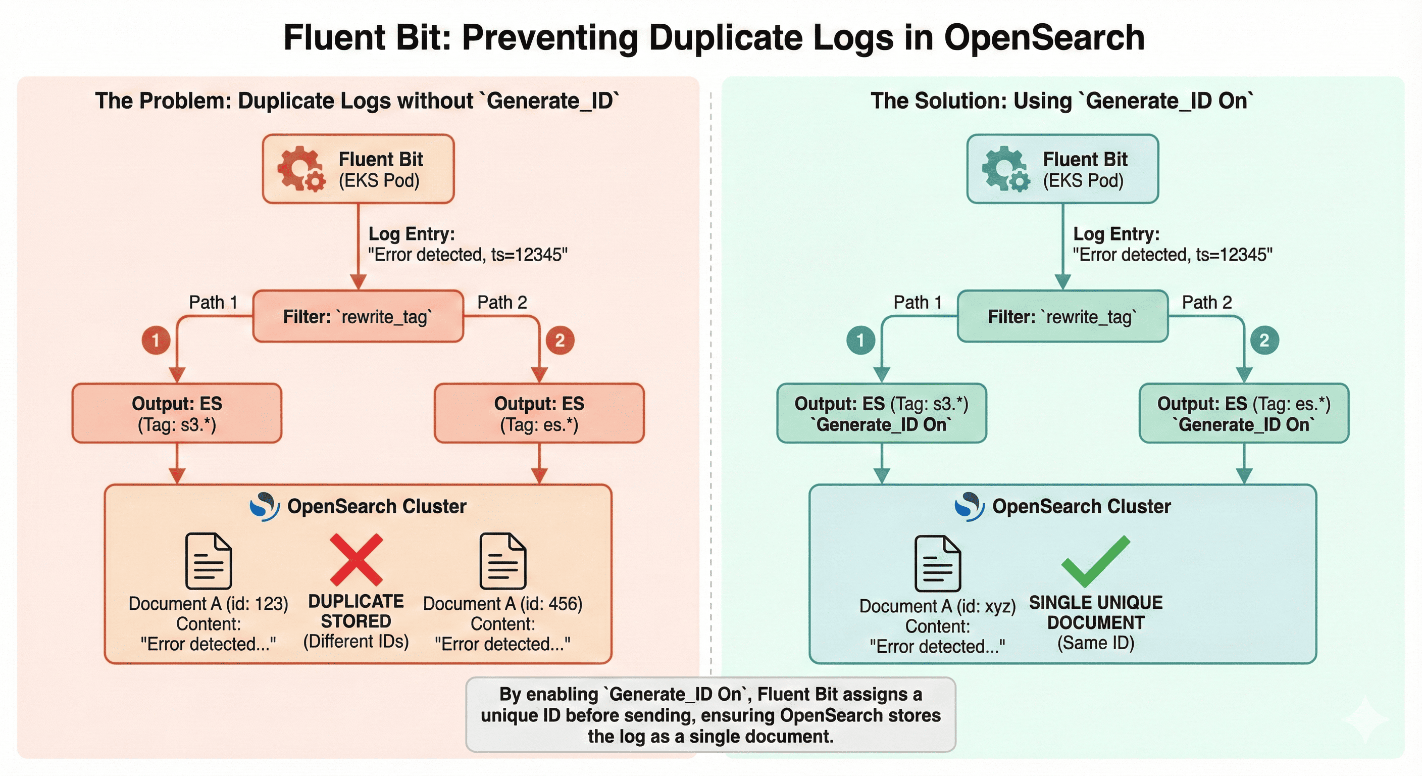 OverviewEKS 환경에서 Fluent Bit을 통해 OpenSearch로 로그를 전달할 때, 같은 로그가 중복으로 저장되는 문제를 경험한 적이 있는가? 우리도 비슷한 문제를 겪었다. 로그 내용과 타임스탬프가 완전히 동일한데도 OpenSearch에는 두 번씩 저장되어 지표나 검색 결과가 과도하게 부풀려지는 현상이 반복되었다. 조사 결과, 각 로그가 서로 다른 `_id` 값을 가지고 있어 OpenSearch가 이를 서로 다른 문서로 인식하고 있었던 것이 원인이었다. 이 글에서는 Fluent Bit의 설정만으로 이 문제를 해결한 실제 사례를 공유한다. 특히 `_id` 충돌이 아닌, 내용은 동일하지만 `_id` 가 달라 중복 저장되는 현상에 대해 설명하고, 이를 Generate_ID 설정으로 해결한 과정을..