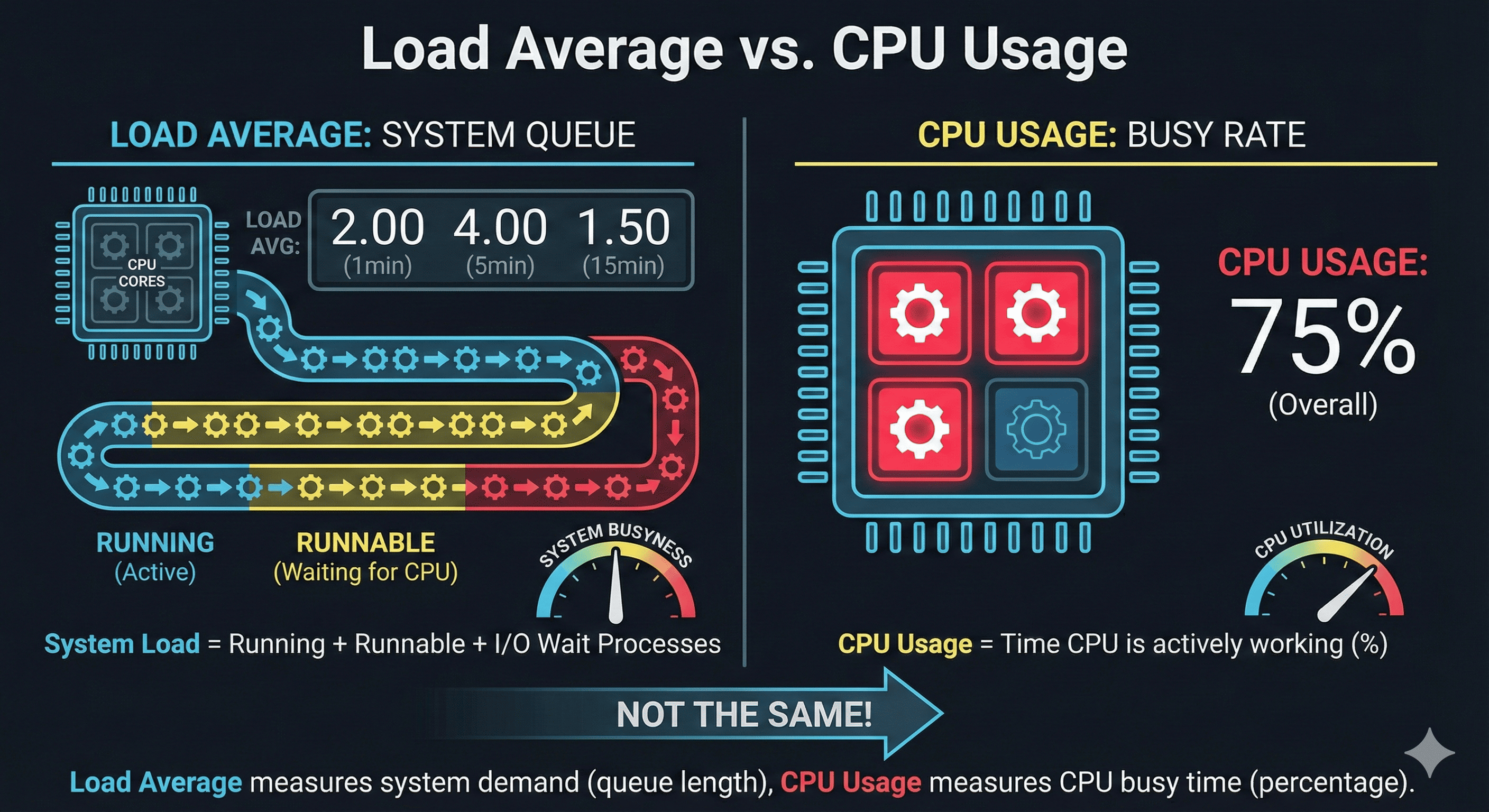 Overview서버나 시스템을 모니터링할 때 가장 먼저 확인하는 숫자 중 하나가 바로 Load Average다.특히 top, uptime, htop 같은 커맨드에서 1분, 5분, 15분 평균값으로 나오는 세 개의 숫자가 익숙할 것이다. 하지만 이 숫자가 CPU 사용률과 같다고 생각한다면 오해다.“숫자가 2면 CPU가 200% 쓰인다는 뜻인가요?”, “로드가 5면 무조건 과부하인가요?” 같은 질문은 지금도 자주 들리는 오해다. 이번 글에서는 Load Average의 정확한 의미, 해석 방법, 그리고 실무에서의 기준선 설정 방법까지 하나씩 짚어본다. 📅 관련 글2023.01.13 - [CS 지식] - [CS 지식1.] 웹 브라우저의 동작원리2023.02.23 - [CS 지식] - [CS 지식2.]..